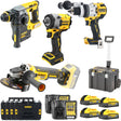 Trusa Dewalt DCK5017H4T-IT 18V 5Ah Este format dintr-o ciocană perforatoare, o șurubelniță cu impact, o ciocană perforatoare, o polizor și baterii PowerStack.
