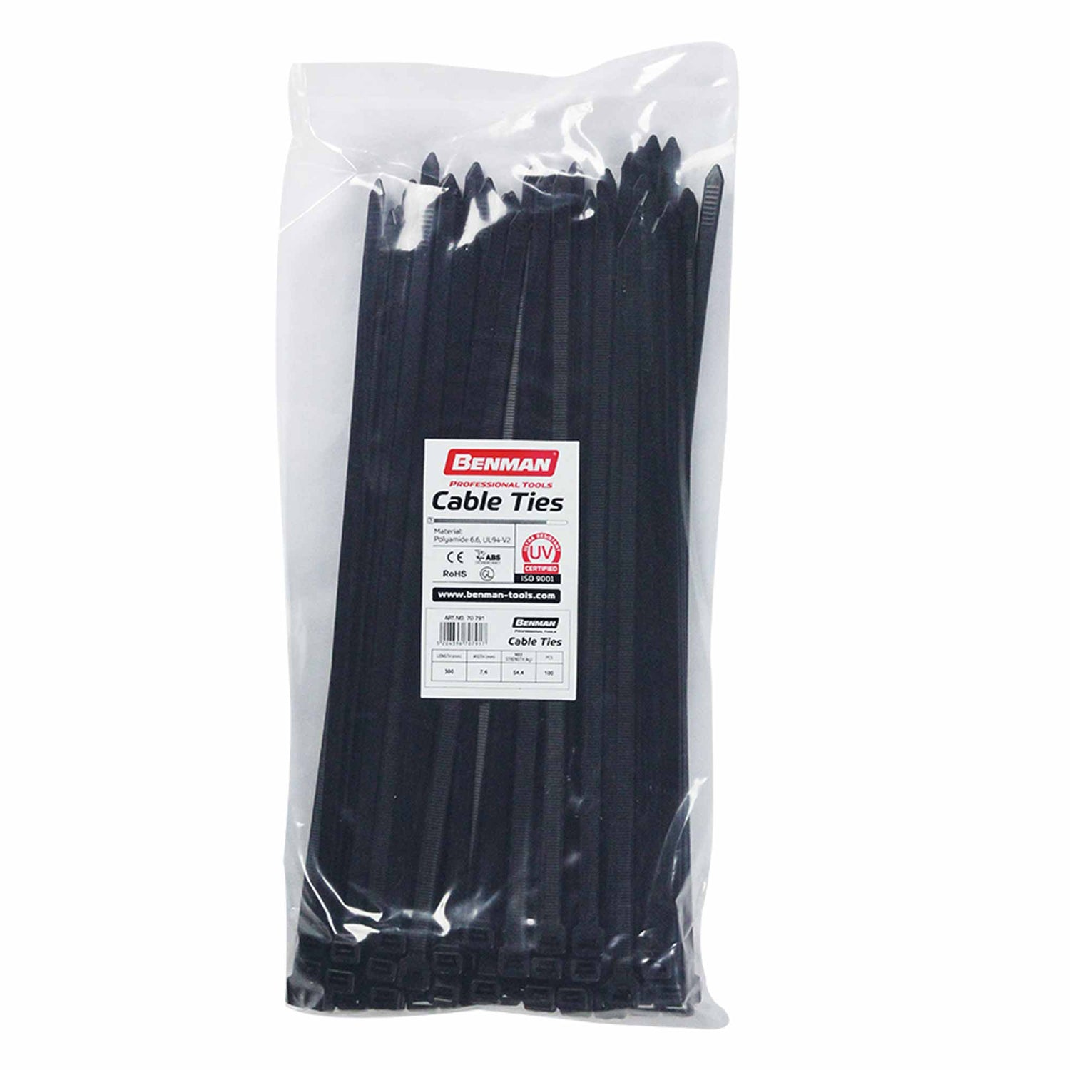 Curele negre de strângere Benman 100 buc, cu cleme interne care permit o bună etanșare pozitivă pe fasciculele de cabluri și țevi.