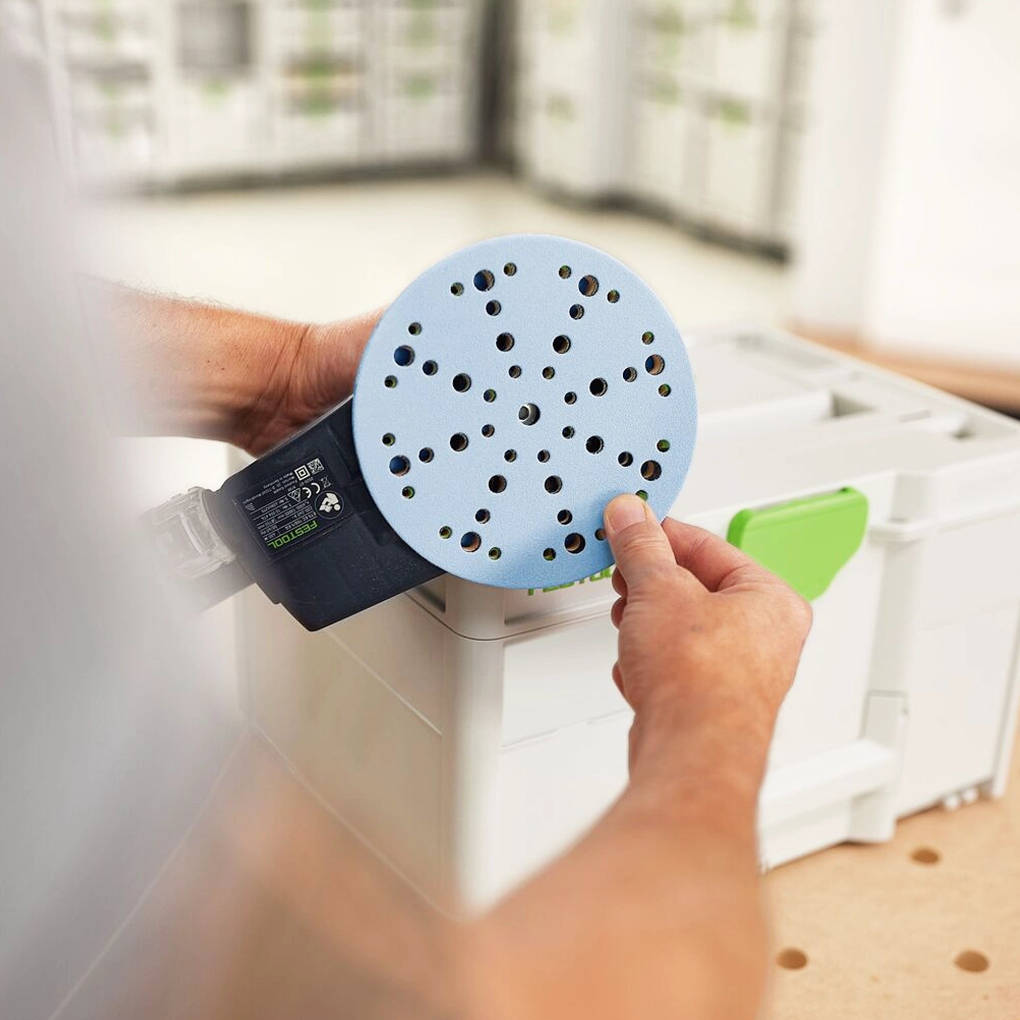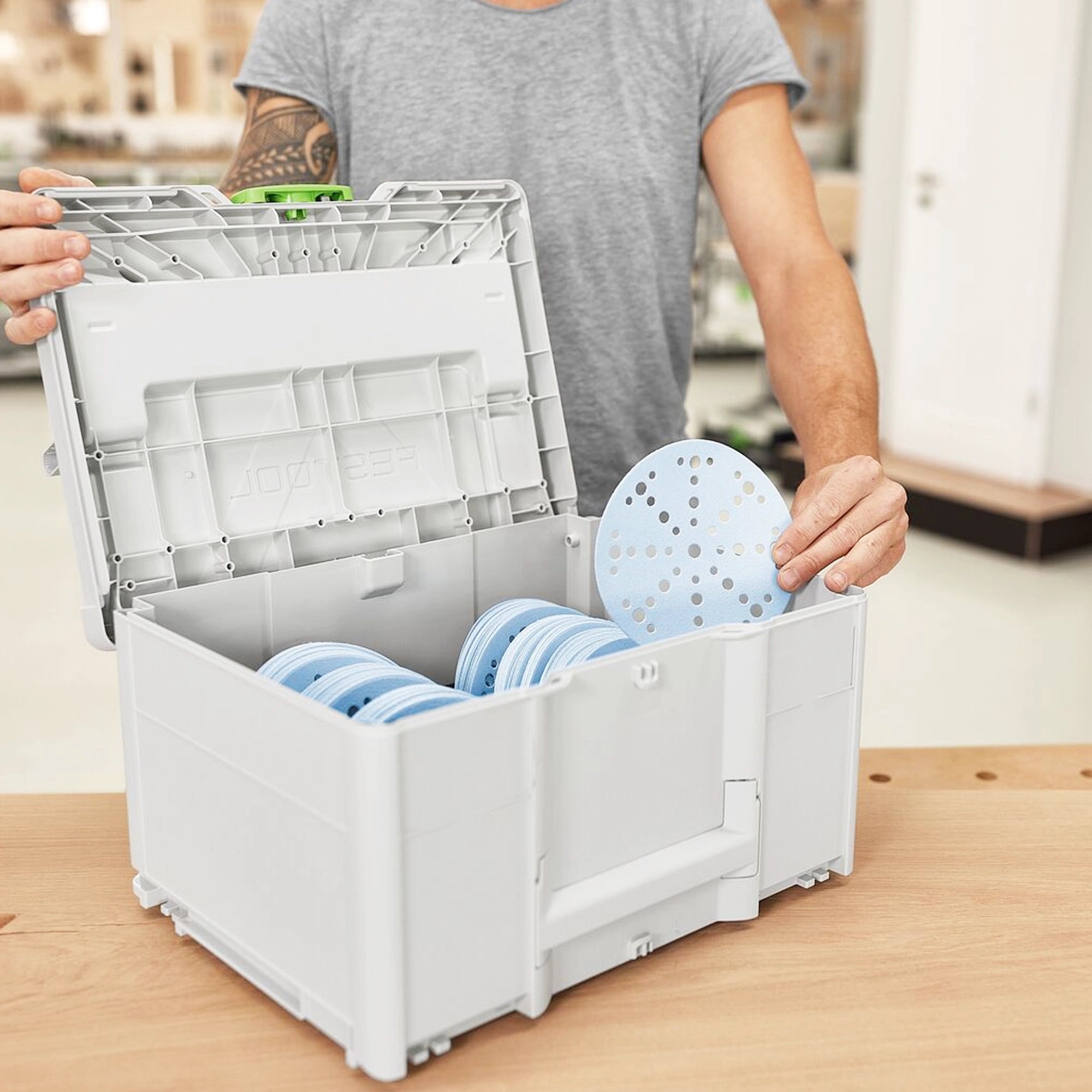 Systainer for Granat abrasive Festool SYS-STF D150 GR-Set for abrasives is the ideal addition to your sander. With its wide range of grit sizes, it offers the ideal introduction to the world of Granat abrasives. 20 Granat sanding discs from P60 to P220 are always at hand. The sorted structure according to grit size is a matter of course in the Systainer for abrasives. Each compartment has its place, so that you can find the grit you need in an instant. The simple integration allows you to always have the desired grit to hand. The Systainer optimally protects the abrasives from negative influences such as dust, splashes of water and kinks. In addition, it allows the abrasive to be easily transported and connected to other Systainers, thus leaving a professional impression on your customers. From the workshop to the construction site, the Systainer for abrasives offers you flexibility in your daily work. Thanks to the proven T-LOC control element, closing, opening and coupling is child's play. The Systainers are compatible with each other and can be combined with all previous Systainer generations as well as with many other machines and accessories. When it comes to sanding, then with Granat: for your perfect surfaces.