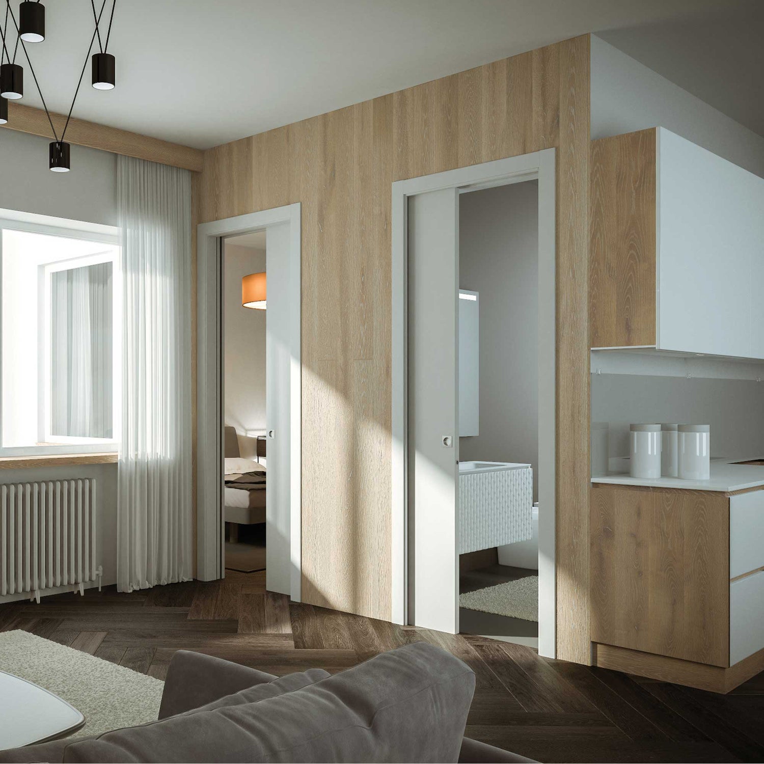 • Coșul central: permite disparitia a doua usi glisante care aluneca in directii opuse, permitand accesul in doua incaperi diferite cu o singura solutie.