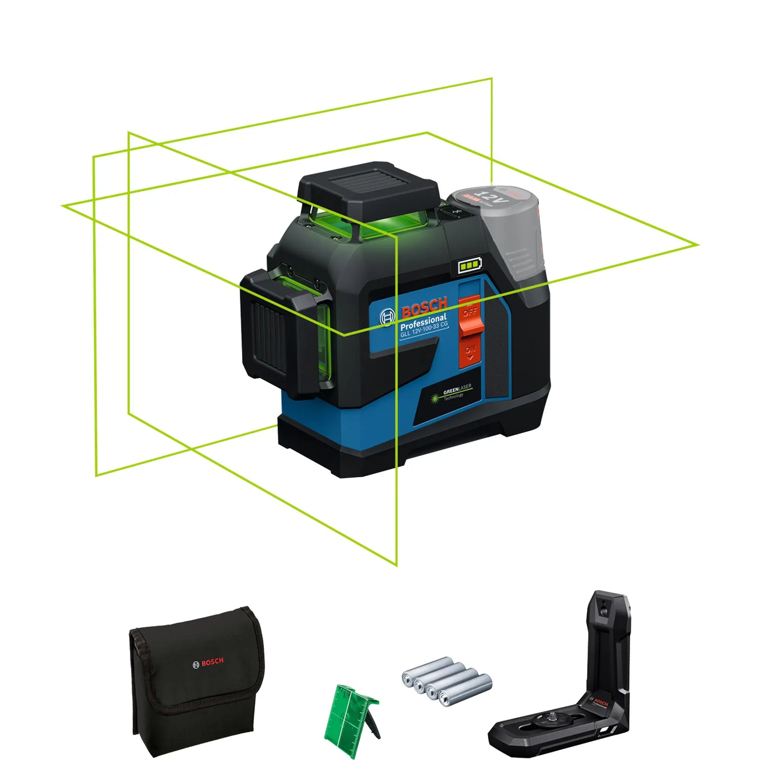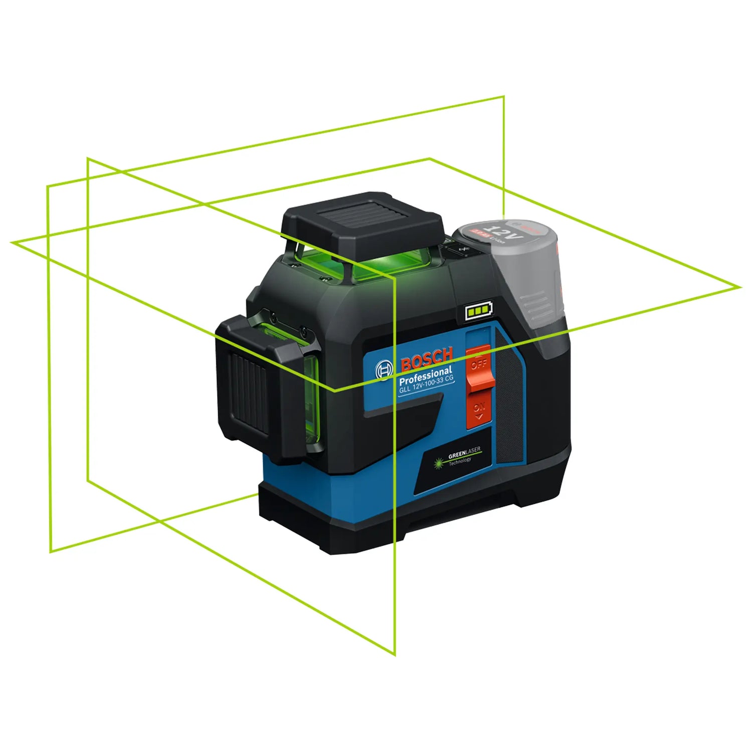 Nivelă laser Bosch GLL 12V-100-33 CG PRO 12V cu 3 linii verzi la 360°, control prin aplicație de la distanță și sursă dublă de alimentare pentru versatilitate maximă.